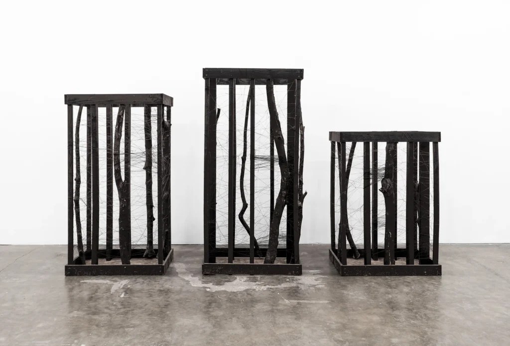 Round 14: (Un)box by Austin-based artist taylor barnes transforms the cage into an escape shelter. Wood, fallen limbs, nails, and fiber form a cage within a cage. Inspired by her research on barracoons, a type of barracks used historically for the temporary captivity of enslaved people or criminals, barnes aims to re-conceptualize the notion of confinement. Her construction of three crate-like forms acknowledge the veiled histories of “people as cargo” recontextualizing the structures as safe havens of escape. This timely installment evokes notions of the unknown, limitations and the privilege of a certain future.